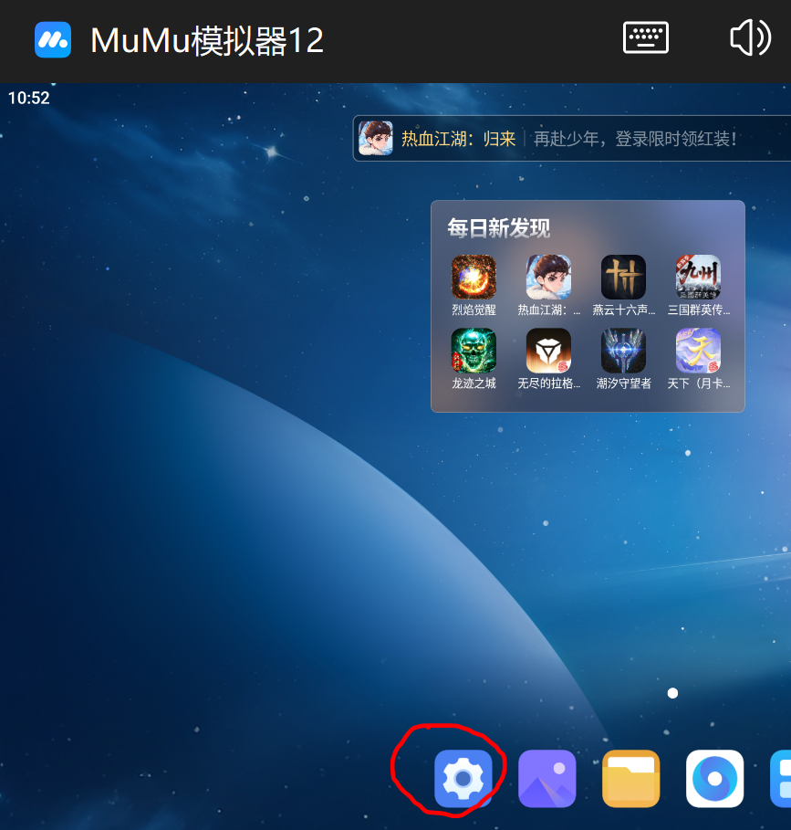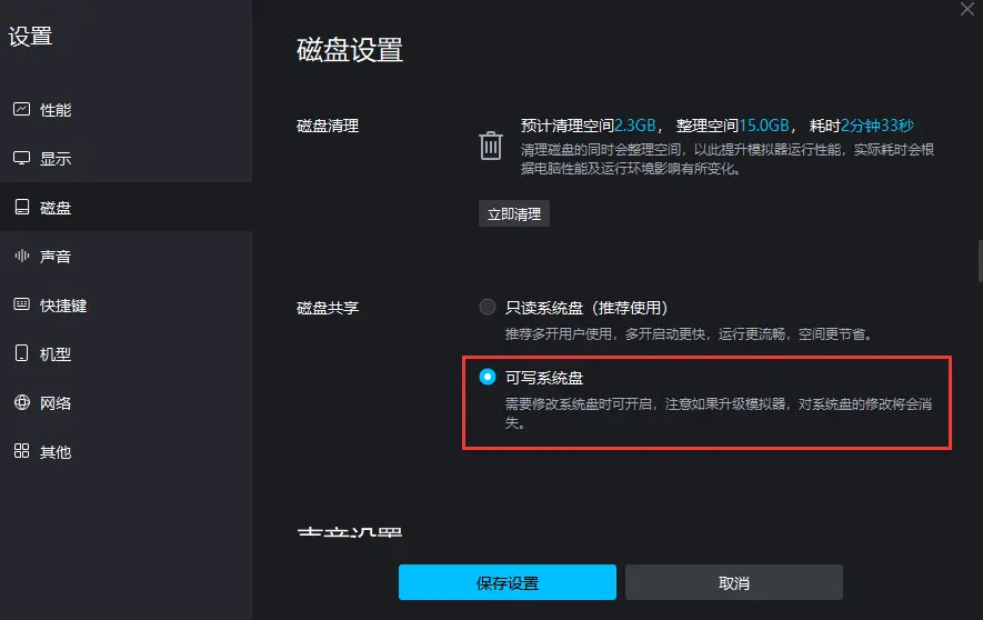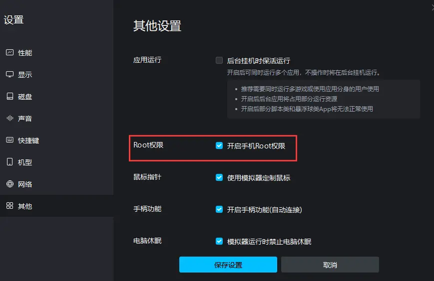 打开MuMu模拟器右上角菜单-设置中心,勾选开启手机ROOT功能,并将磁盘改为可写系统盘,保存设置后重启模拟器;