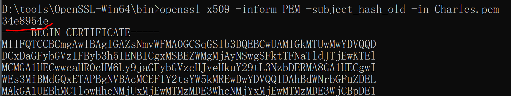若输出结果第一行类似:34e8954e,则将Charles.pem更名为 34e8954e.0;