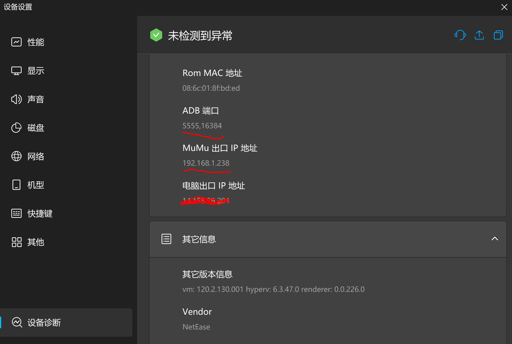 用adb命令连接模拟器,模拟器地址和adb端口可以在设备诊断中找到