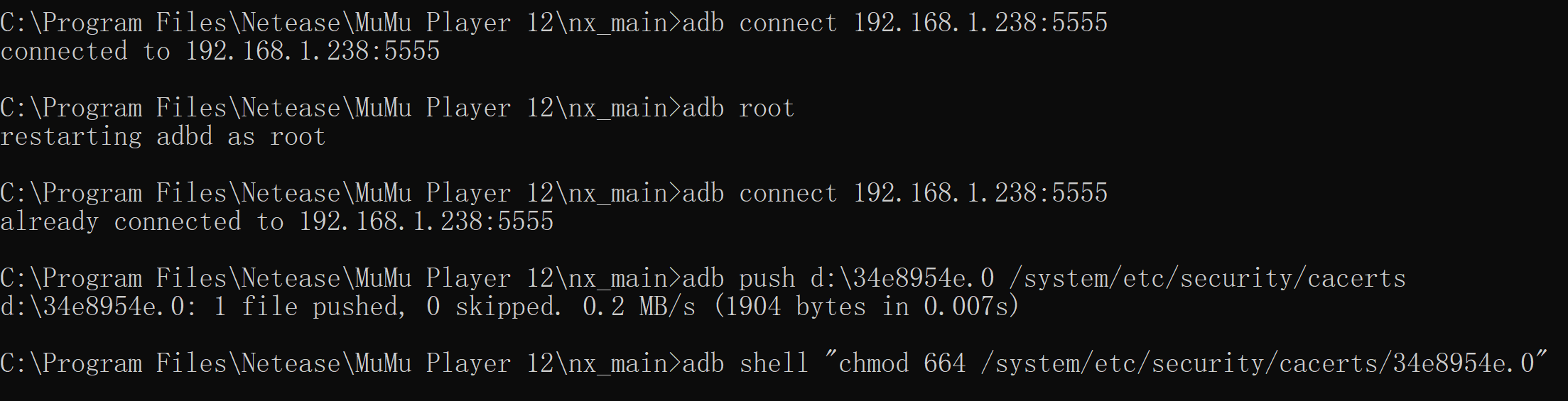 给模拟器安装证书(计算机本机IP为192.168.1.124,模拟器通过桥接方式连接网络,IP地址是192.168.1.238)