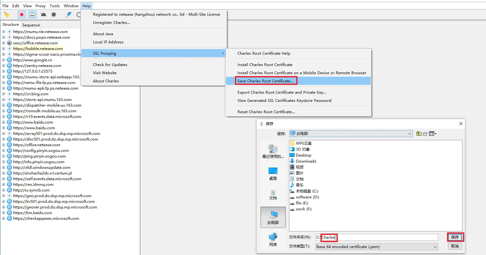 在Charles主页面点击顶部菜单栏—Help— Save Chales Certificate—保存到本地,如保存为Charles.pem;