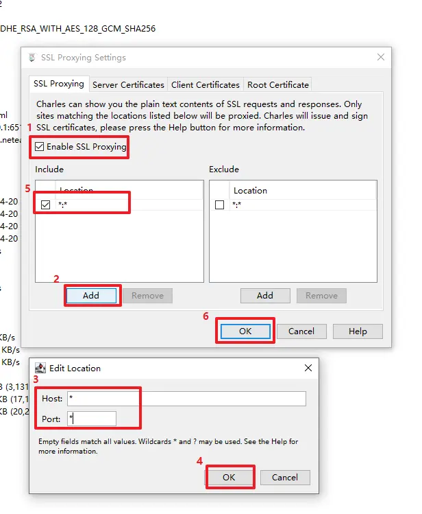 返回Charles主页面,点击顶部菜单栏— Proxy(代理)— SSL Proxying Settings(SSL代理设置),勾选启用SSL代理,添加主机和端口都为*,并保存;